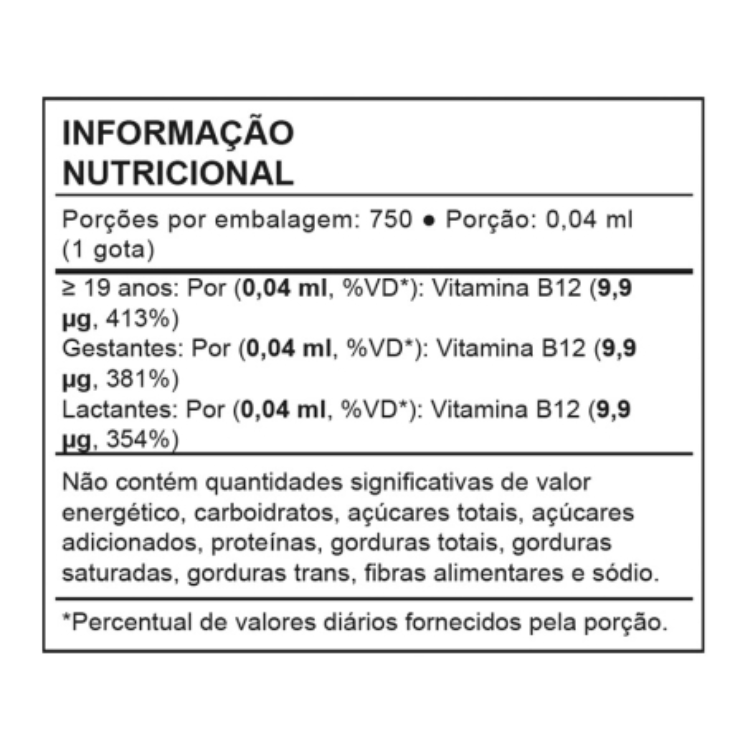 9,90 mcg de Vitamina B12 por gota - 750 gotas por frasco.