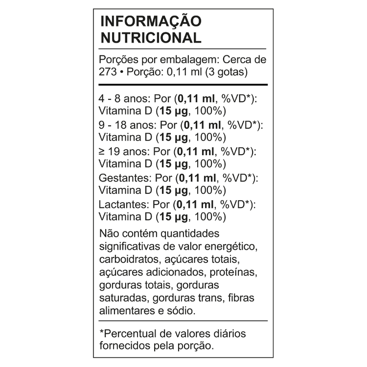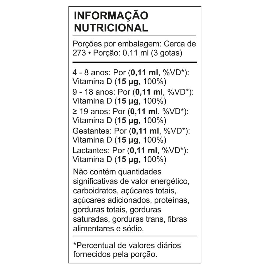 200ui por gota - 820 gotas por frasco. Sem gosto de óleo